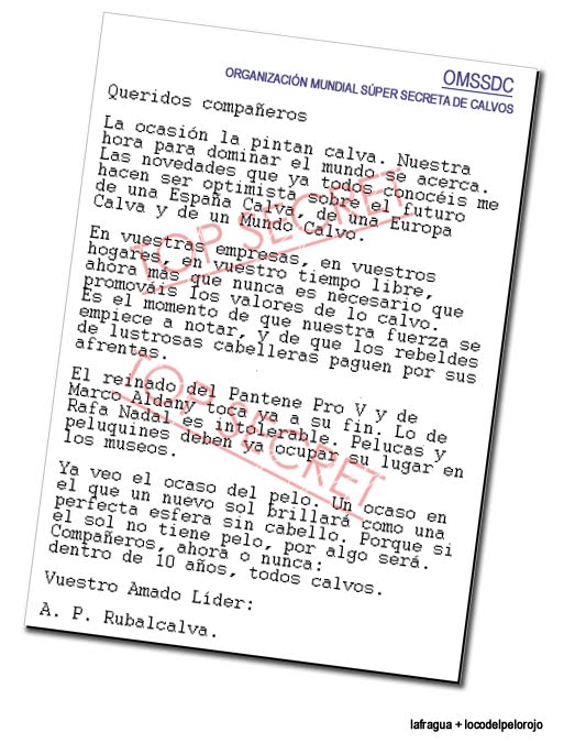 Toño y yo llevábamos tiempo sospechándolo: el lobby calvo está muy cerca de dominar el mundo. La llegada de Rubalcaba (alías «Rubalcalva«) al primer escalón de la sucesión de Zapatero -como ya lo intentara, sin éxito, Joaquín Almunia– ha encendido todas las alertas. El «calvos del mundo, uníos» resuena con rabia frente a los escaparates de todas las peluquerías y de las tiendas que venden crecepelo. El calvo de La Sexta, el de El Buscador y Mister Proper sonríen. El documento que ha descubierto Toño lo confirma. Y, por si fuera poco, la derecha mediática se alía con este grupo de poder: «Tildar de machista a León de la Riva es tan estúpido como tildar de feminista a quien haga chistes con la calva de Rubalcaba», ha dicho Juan Manuel de Prada. ¿Se han empezado a quitar las pelucas? ¿Veremos un nuevo amanecer calvo?