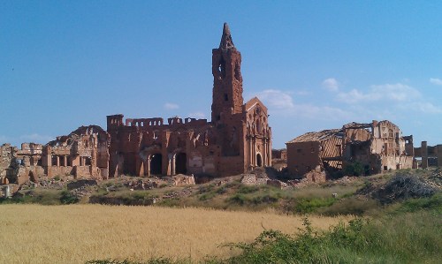 A Belchite se llega a través de un paisaje seco y algo triste, que anticipa la estampa que nos recibe: una iglesia y un monasterio, semiderruídos, como petrificados tras un bombardeo en el frente de Aragón.