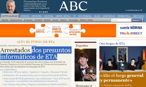 Lo vemos a diario: cada vez que el periodista no tiene clara una noticia, la sustenta en datos cogidos por los pelos, o habla de suposiciones, se parapeta tras el escudo del «presunto«. «Presunto asesino», «presunto culpable», «presunto esto», «presunto lo otro». Hoy hemos ido un paso más allá: ABC titula en portada: «Arrestados dos presuntos informáticos de ETA«. ¿Qué será lo próximo? ¿Compraremos el pan a presuntos panaderos? ¿Pediremos cerveza a presuntos presuntos camareros?