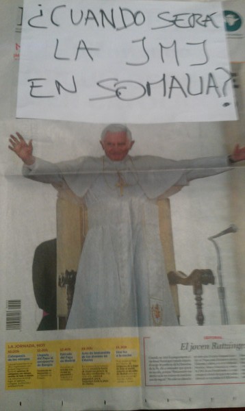 Dado el matiz de violencia policial y represión de la libertad de expresión que están tomando los acontecimientos, propongo una acción reivindicativa sencilla y pacífica: colgar carteles que critiquen, respetuosamente, el dispendio y el gasto de la Jornada Mundial de la Juventud. Yo que colgado este, en el que puede leerse «¿Para cuándo una JMJ en Somalia?«. Si os animáis, seguidme #protestaJMJ