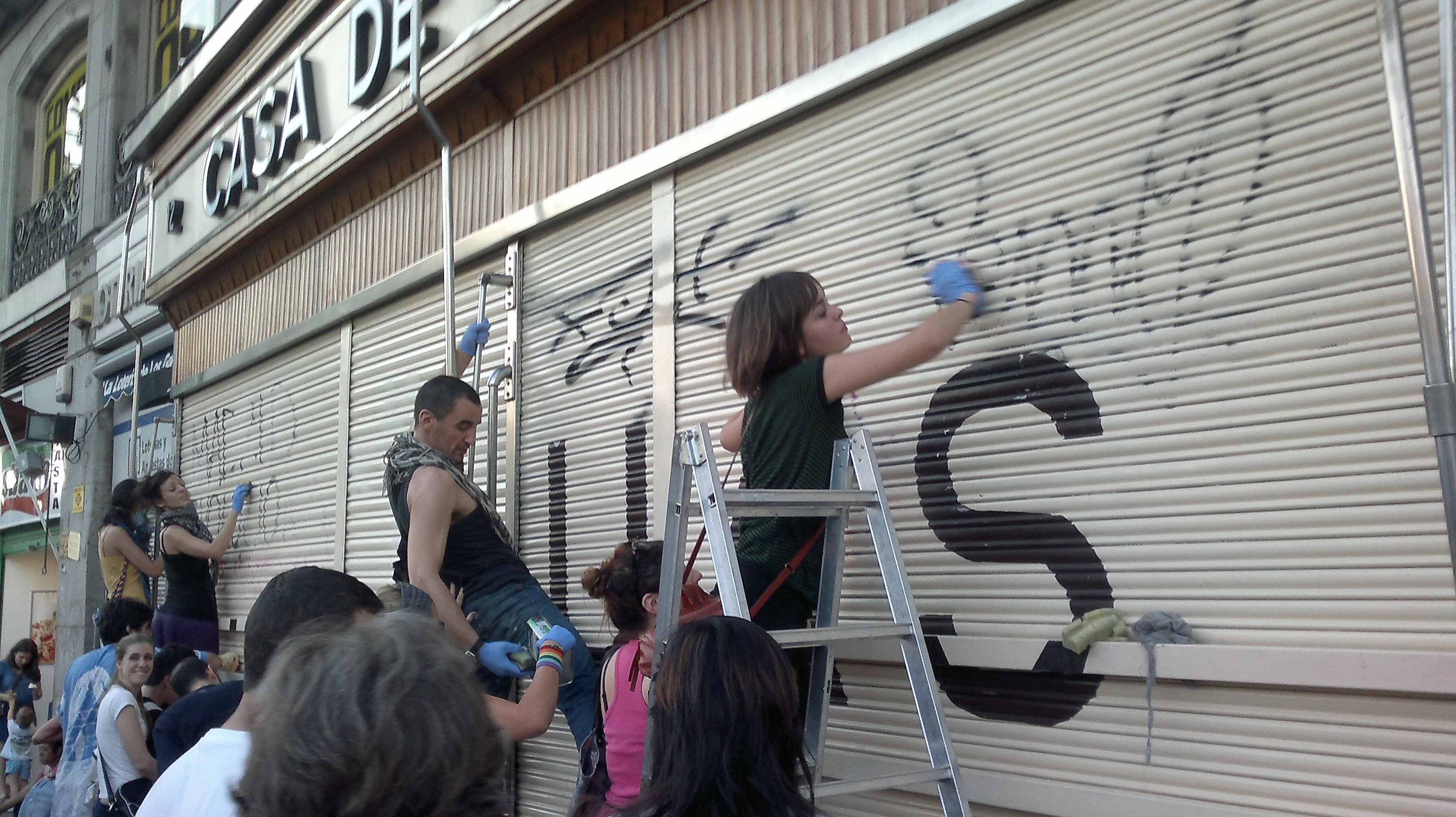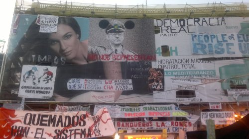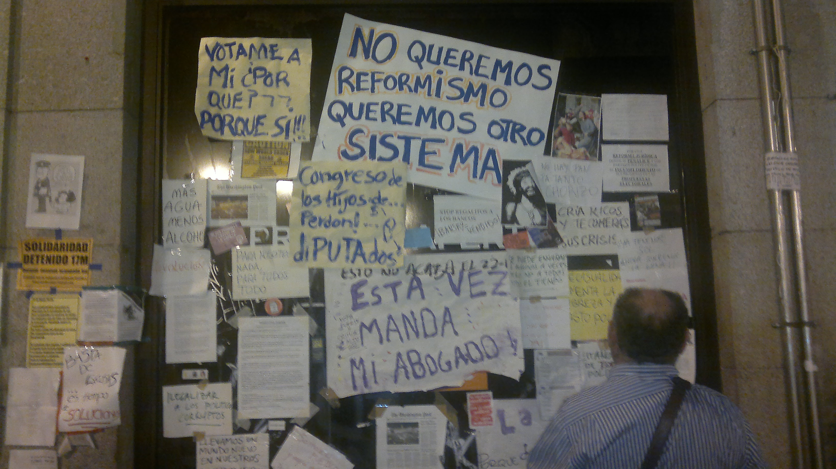 Una de las cosas que más llama la atención cuando llegas a la Puerta del Sol es la cantidad de carteles que lo inundan todo, desde los kioskos hasta las paredes, además de los que llevan quienes protestan. La mayoría de ellos destilan ingenio e ironía, del tipo «No hay pan para tanto chorizo» o este que me encanta, «Pedís austeridad desde un Mercedes Clase A»